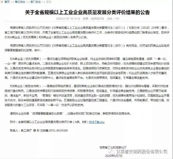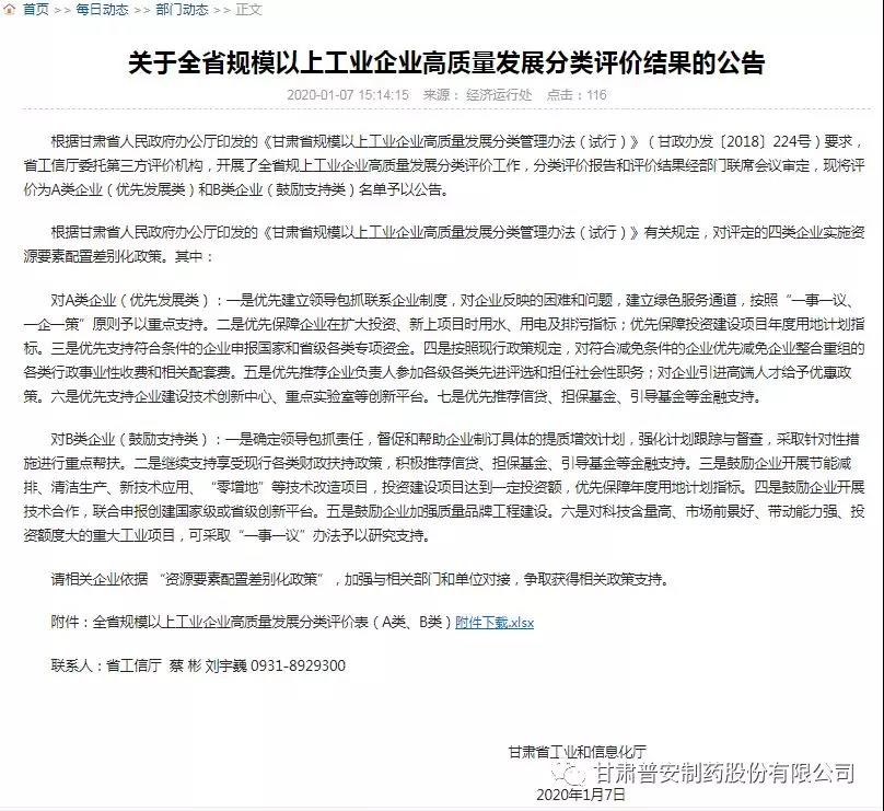 1月7日,根據(jù)甘肅省工業(yè)和信息化廳發(fā)布的“關(guān)于全省規(guī)模以上工業(yè)企業(yè)高質(zhì)量發(fā)展分類評價結(jié)果”的公示,普安股份被評為全省規(guī)模以上工業(yè)企業(yè)高質(zhì)量發(fā)展A類(優(yōu)先發(fā)展類)企業(yè),位列醫(yī)藥行業(yè)前三。此次分類評價工作經(jīng)專業(yè)第三方評價機構(gòu)評審,分類評價報告和評價結(jié)果經(jīng)部門聯(lián)席會議審定,最終確定企業(yè)分類評價結(jié)果。普安股份將依據(jù) “資源要素配置差別化政策”對A類企業(yè)的規(guī)定,加強與相關(guān)部門和單位對接,爭取獲得相關(guān)政策支持。
