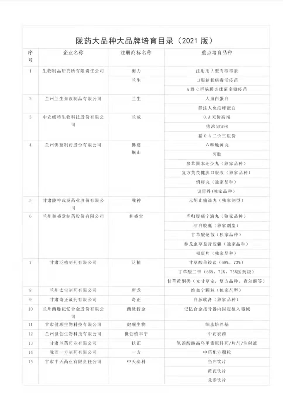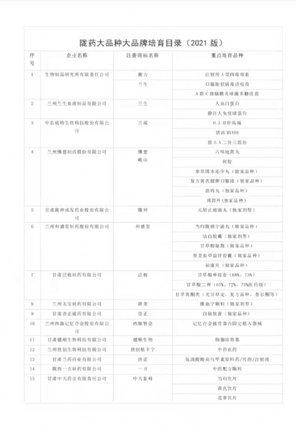 為切實(shí)抓好隴藥大品種大品牌培育工作,根據(jù)《甘肅省人民政府辦公廳關(guān)于支持隴藥大品種大品牌推動(dòng)龍頭企業(yè)發(fā)展政策措施的通知》(甘政辦發(fā)〔2018〕131號(hào))要求,經(jīng)公示無異,現(xiàn)將隴藥大品種大品牌培育目錄(2021版)予以公告。