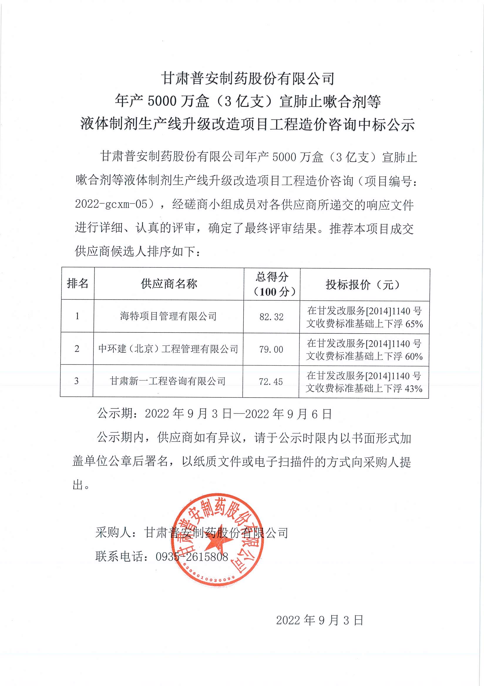 甘肅普安制藥股份有限公司年產(chǎn)5000萬(wàn)盒(3億支)宣肺止嗽合劑等液體制劑生產(chǎn)線升級(jí)改造項(xiàng)目工程造價(jià)咨詢(xún)中標(biāo)公示