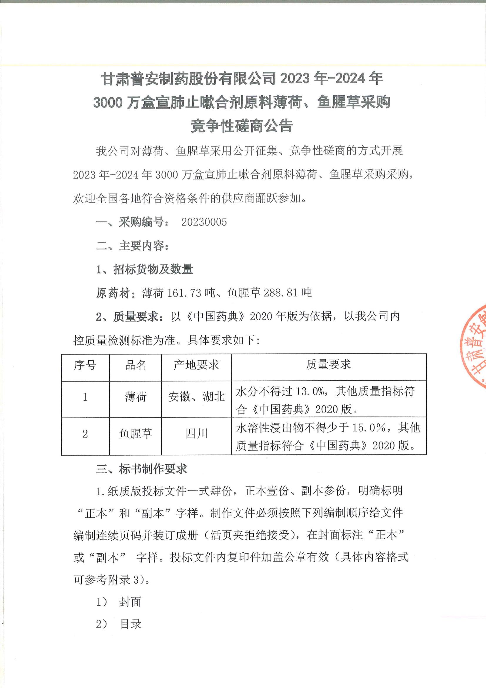 甘肅普安制藥股份有限公司2023年—2024年3000萬盒宣肺止嗽合劑原料薄荷、魚腥草采購競(jìng)爭(zhēng)性磋商公告