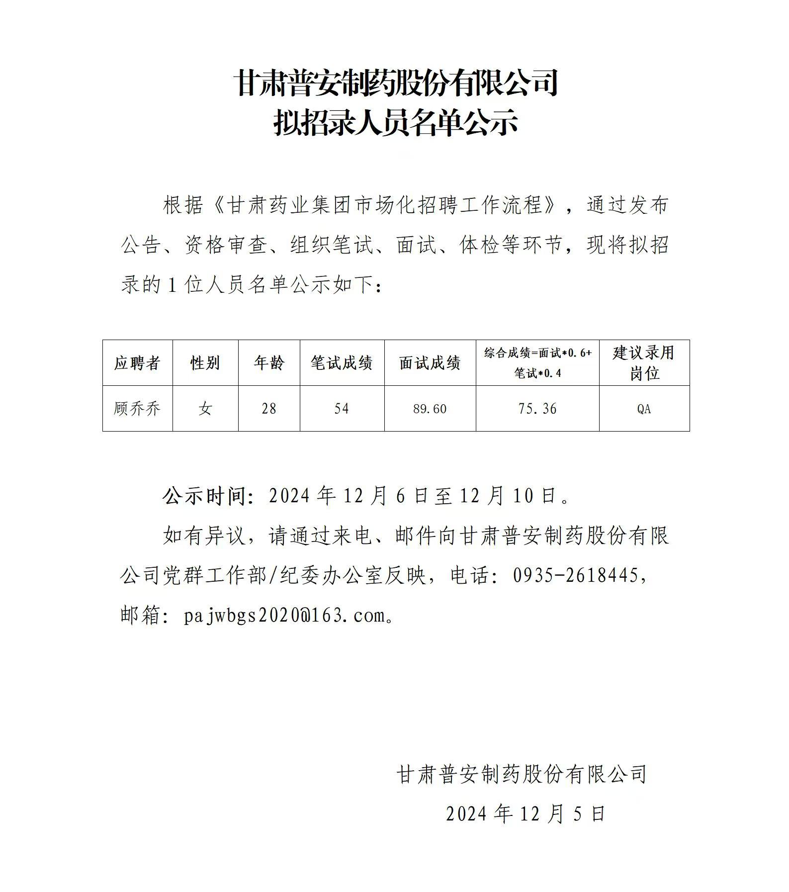 甘肅普安制藥股份有限公司擬招錄人員名單公示