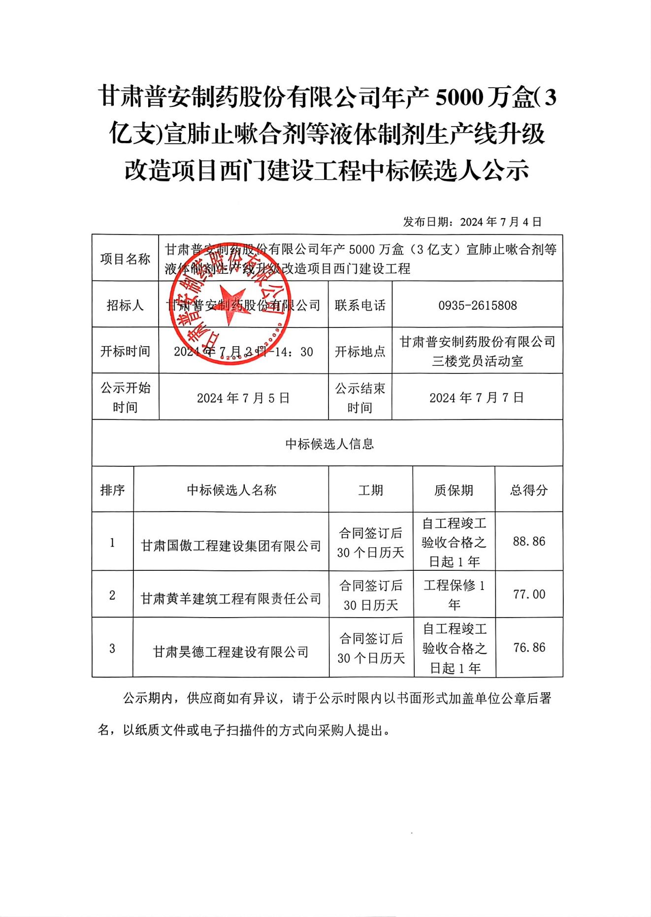 甘肅普安制藥股份有限公司年產(chǎn)5000萬盒(3億支)宣肺止嗽合劑等液體制劑生產(chǎn)線升級(jí)改造項(xiàng)目西門建設(shè)工程中標(biāo)候選人公示
