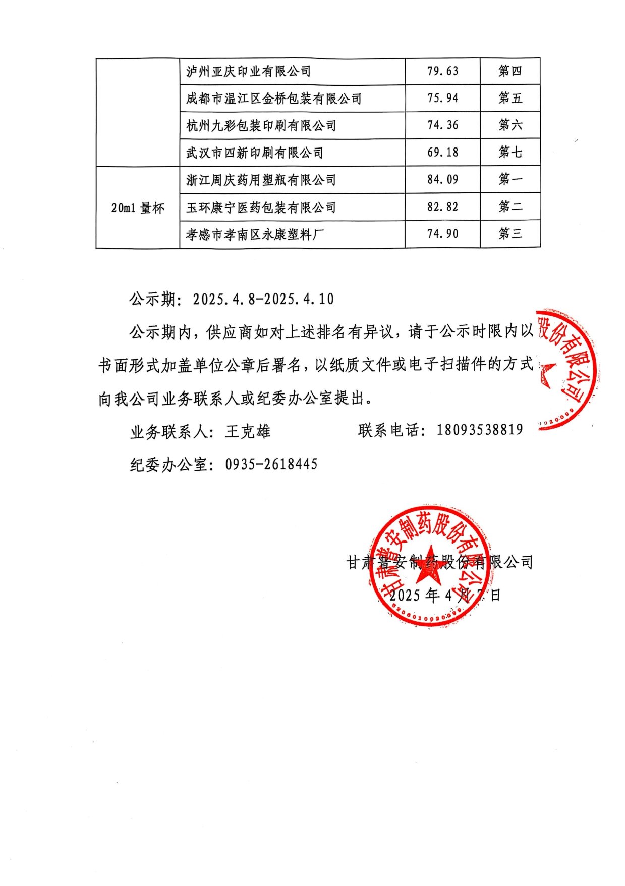 甘肅普安制藥股份有限公司2025年宣肺止嗽合劑包裝材料招標采購結果公示