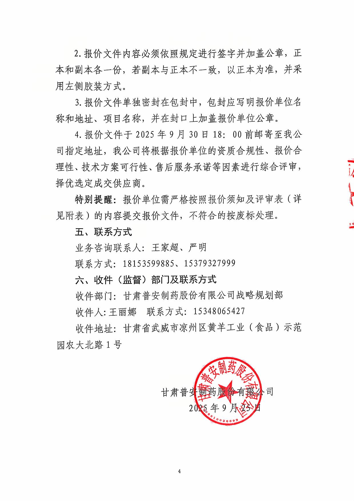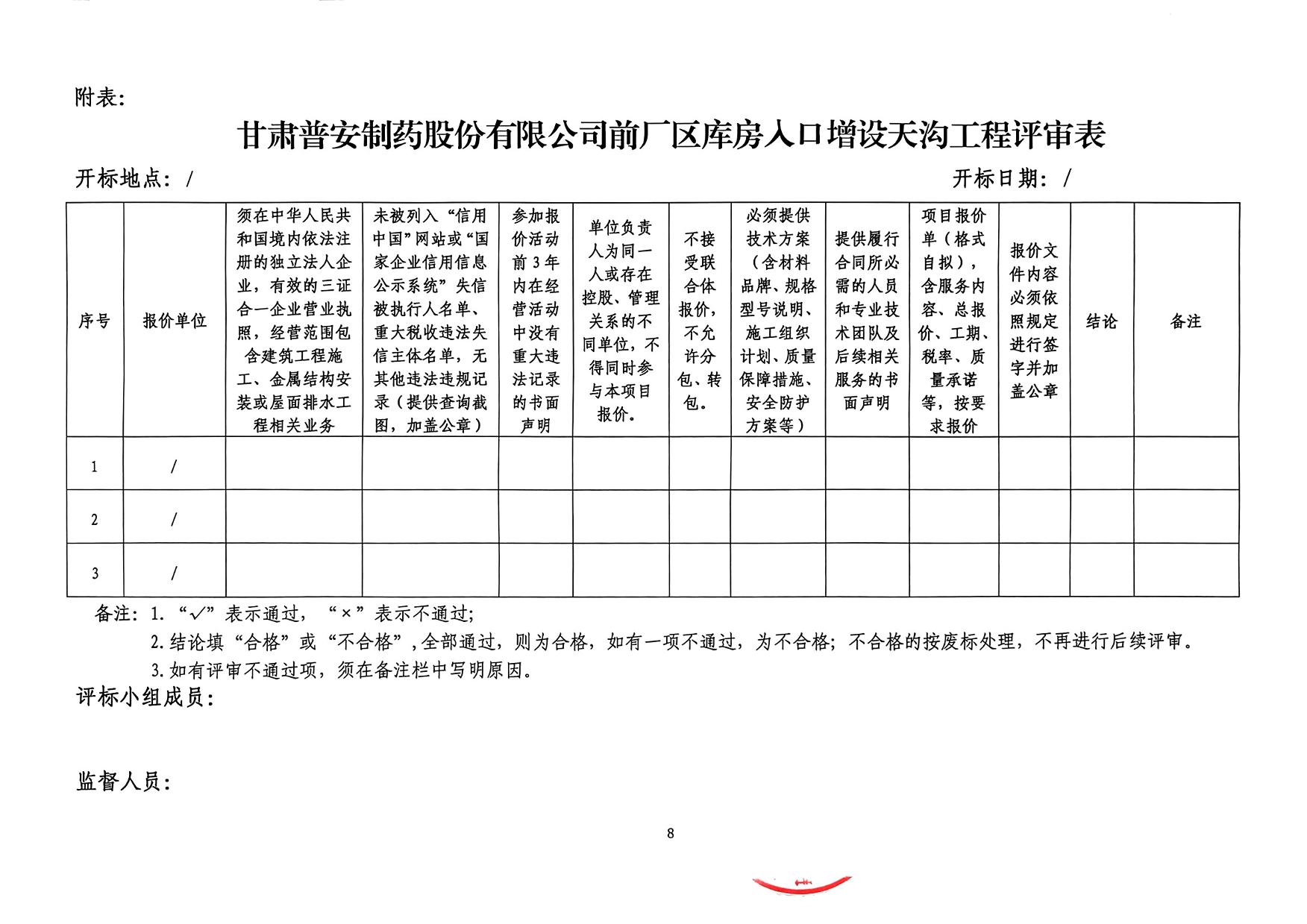 甘肅普安制藥股份有限公司前廠區(qū)庫房入口增設(shè)天溝工程詢價公告