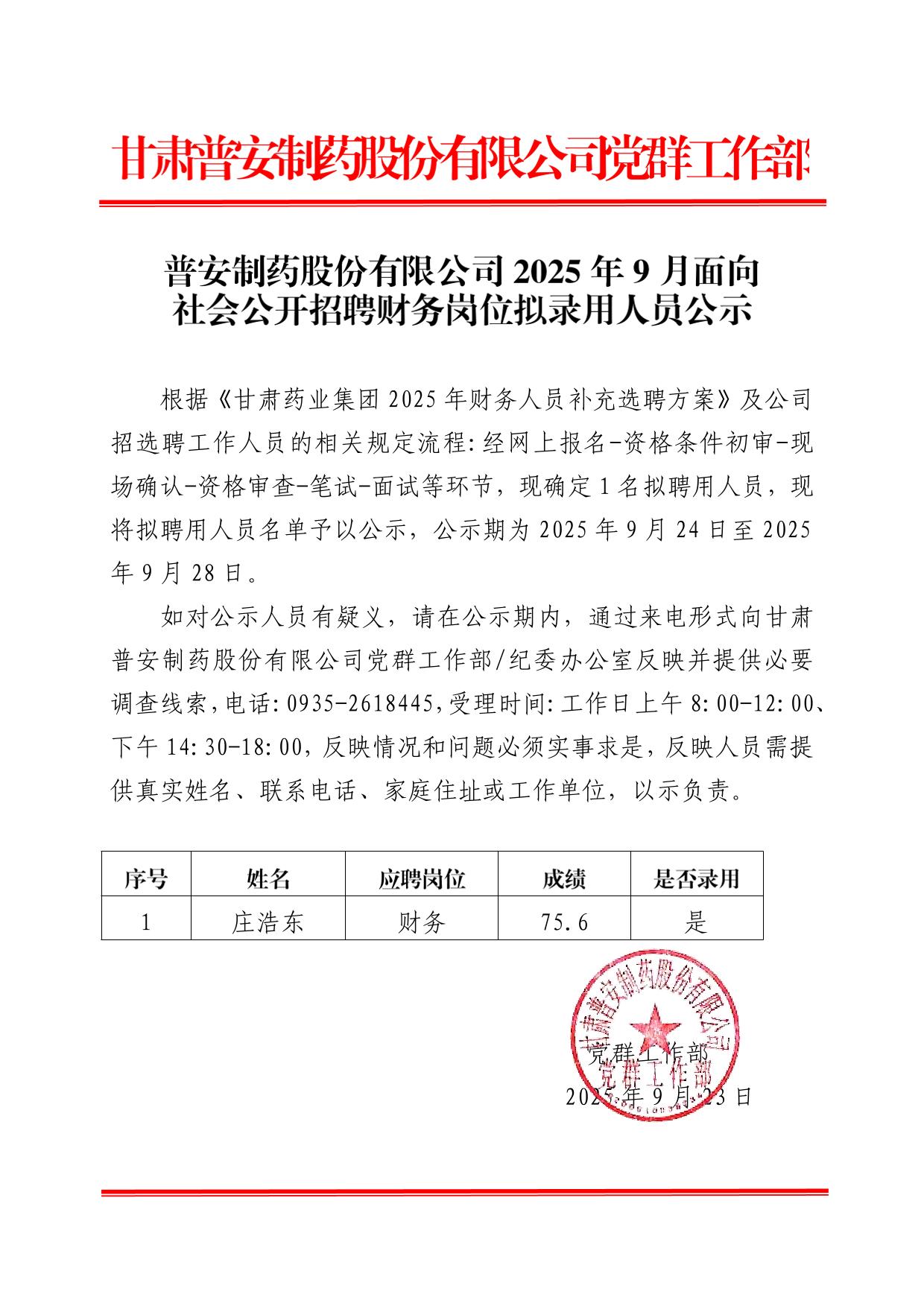 普安制藥股份有限公司2025年9月面向社會公開招聘財務(wù)崗位擬錄用人員公示